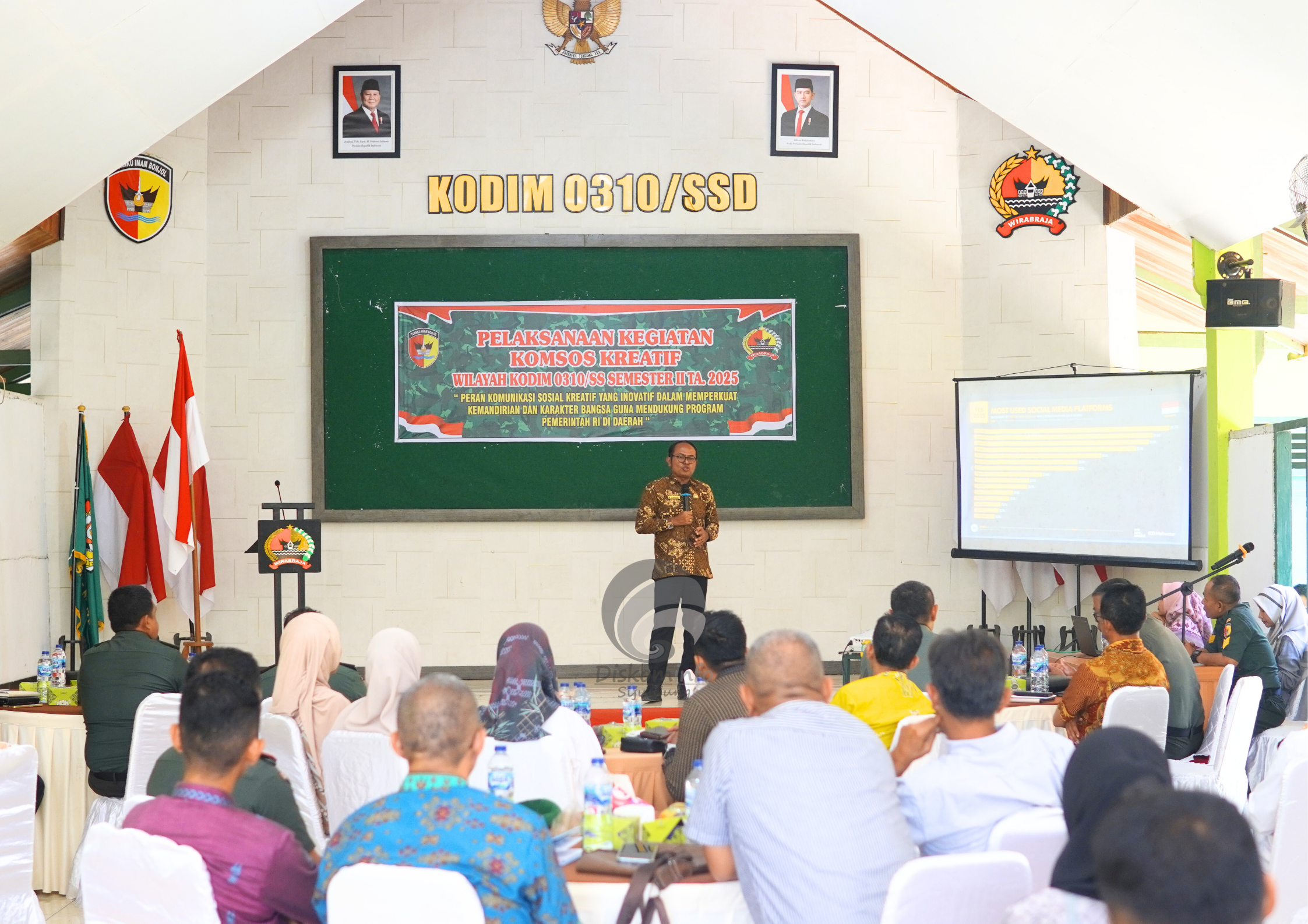 Komando Distrik Militer (Kodim) 0310/SSD menyelenggarakan kegiatan Komunikasi Sosial (Komsos) Kreatif dengan tema “Peran Komunikasi Sosial Kreatif yang Inovatif dalam Memperkuat Kemandirian dan Karakter Bangsa Guna Mendukung Program Pemerintah” pada hari ini, Kamis (30/10/25) bertempat di Aula Makodim Muaro.