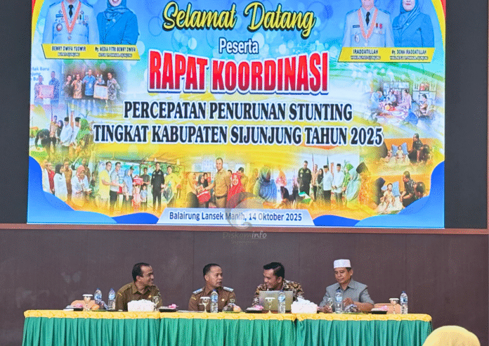 DISKOMINFO SIJUNJUNG – Pemerintah Kabupaten Sijunjung melalui Tim Percepatan Penurunan Stunting (TPPS) menggelar Rapat Koordinasi Percepatan Penurunan Stunting tahun 2025, bertempat di Balairung Lansek Manih Sijunjung, Selasa (14/10/25). Kegiatan ini dihadiri oleh Wakil Bupati Sijunjung, Iraddatillah, jajaran Organisasi Perangkat Daerah (OPD) Terkait, Camat, Wali Nagari, Pimpinan BUMN dan BUMD, Tenaga Kesehatan, Kader Posyandu, serta perwakilan BKKBN Provinsi Sumatera Barat.